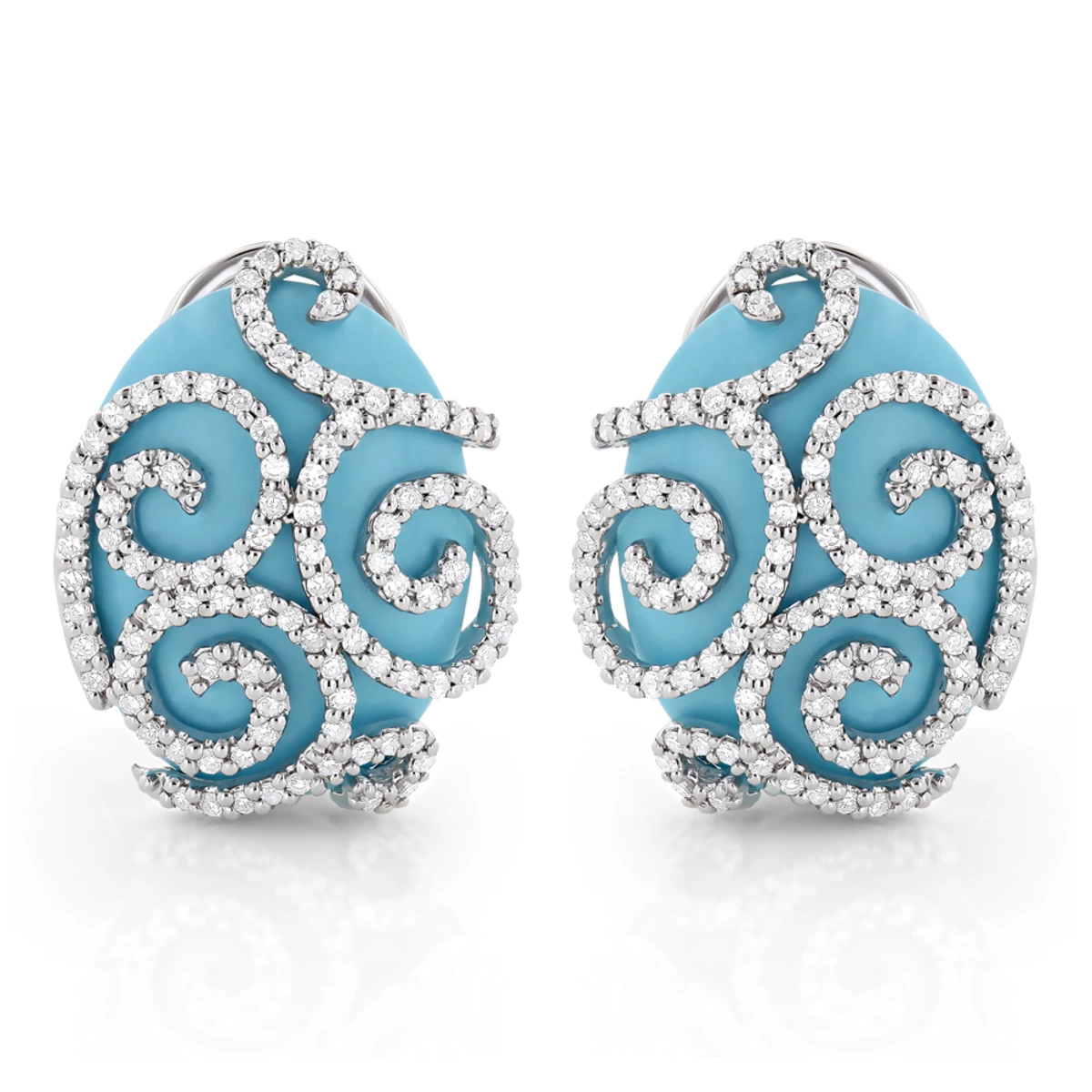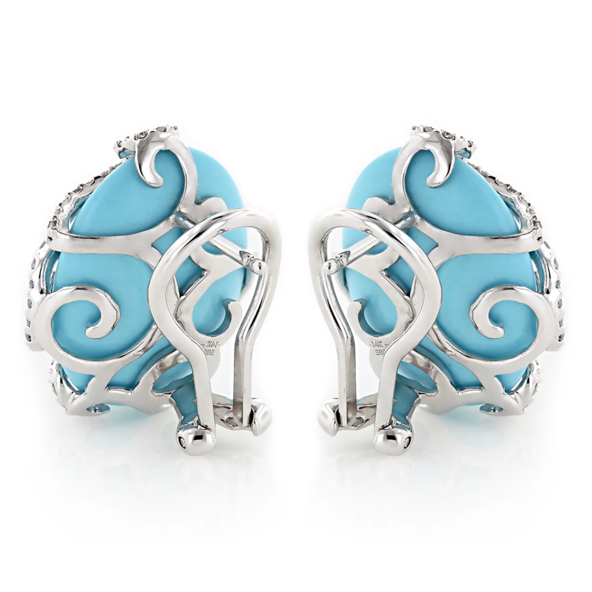 These 14K White Gold Designer Diamond and Turquoise Earrings from our ladies diamond jewelry collection weigh approximately 10 grams and showcase 1.1 carats of sparkling round diamonds, each beautifully set in lustrous gold frames. Featuring an intricate design and a highly polished gold finish, these women’s turquoise and diamond earrings are simply irresistible.