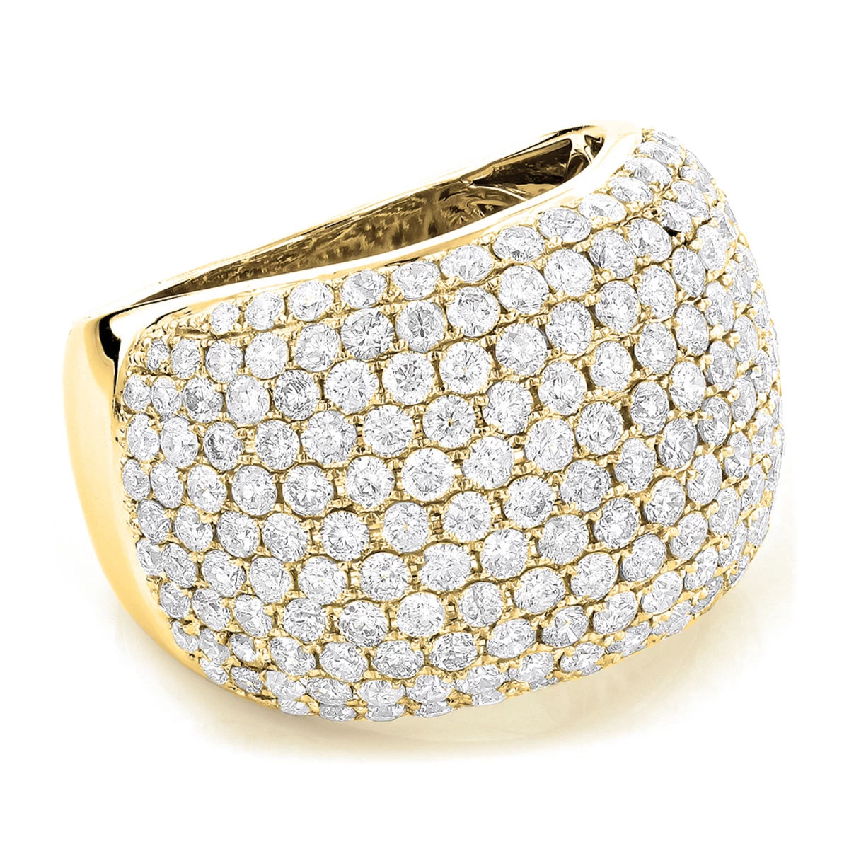 This luxurious Wide 14K Gold Designer Pave Diamond Ring for Women by Luxurman weighs approximately 14 grams and showcases 5 carats of dazzling round diamonds, each masterfully set in a lustrous gold frame. Featuring a dome shaped design, a fine gallery back, and a highly polished gold finish, this women’s diamond ring from our designer diamond bands collection makes a great anniversary band and is available in 14K white, yellow and rose gold.