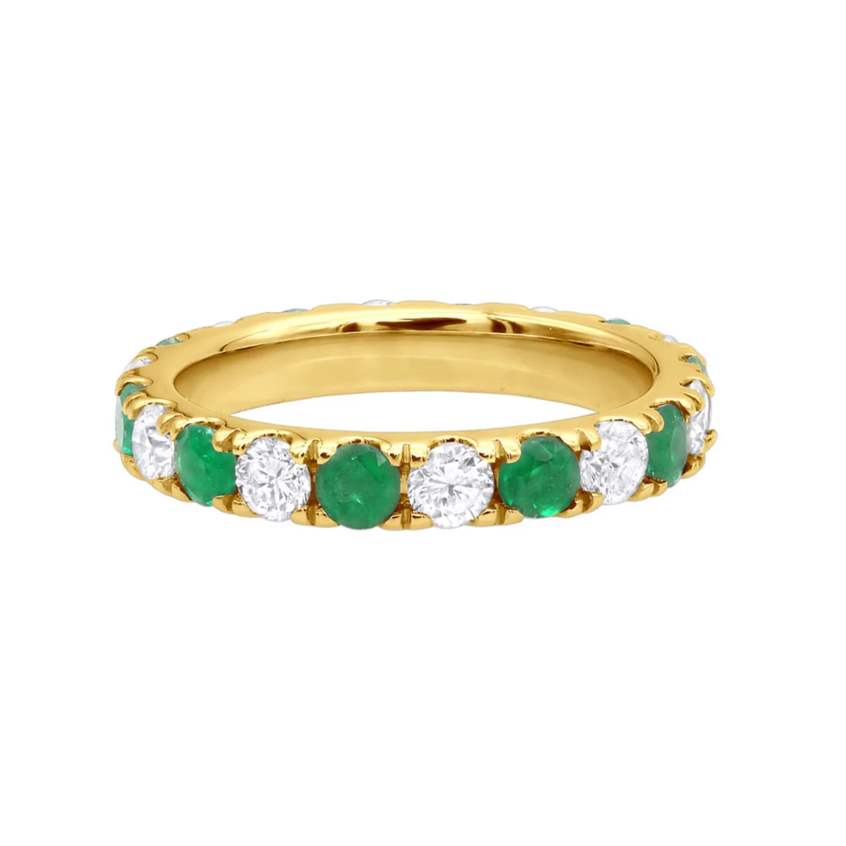 From our eternity bands and anniversary rings collection: This fascinating Unique 14K Gold Diamond and Emerald Eternity Band for Women demonstrates an endless line of glimmering white round diamonds and vibrant deep green round emeralds creating a captivating contrast of colour. Eternity rings symbolise everlasting love and commitment, so this ladies diamond and emerald eternity band will make a truly special wedding or anniversary ring as well as a perfect gift for any other memorable occasion or milestone. The band is 3mm wide, it represents elegance and chic and is worthy of even the most sophisticated ladies. Choose this high quality band crafted from the finest 14k white, yellow or rose gold or contact us to customize it to your specifications (we can also make this ring in 18k gold, Platinum and with any combination of diamonds and gemstones).