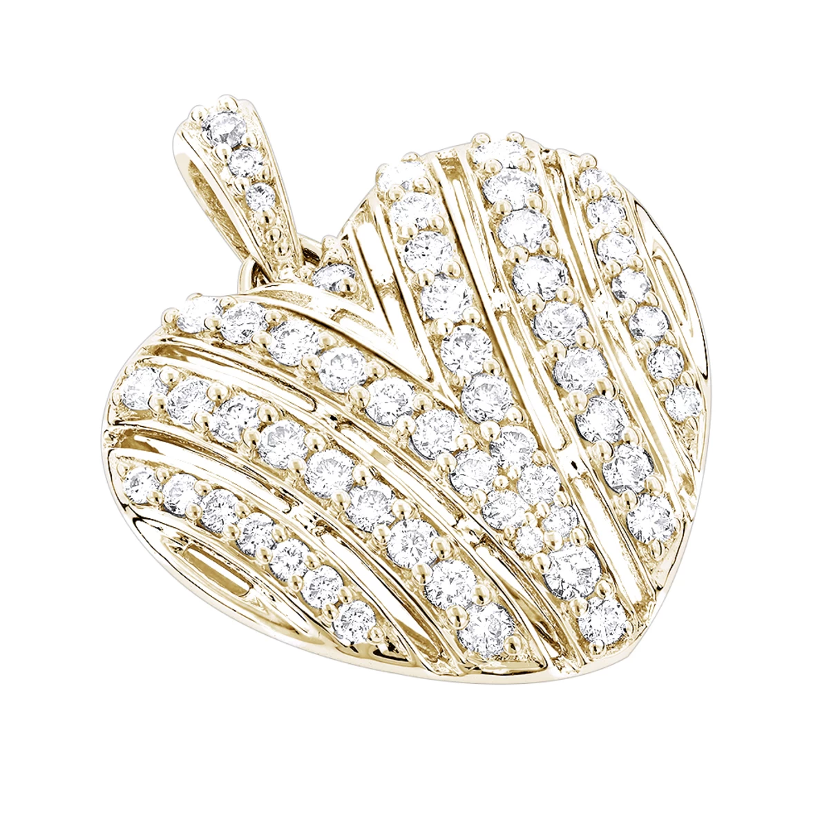 This lovely 14K Gold Diamond Heart Pendant weighs approximately 5 grams and showcases 1.15 ctw of sparkling round diamonds. Featuring an intricate design, a fine gallery back and a highly polished gold finish, this ladies diamond heart pendant is available in 14K white, yellow and rose gold. Please note: the chain is for illustration purposes and must be purchased separately. You also can personalize this piece or check we’ve already made and create your own design.