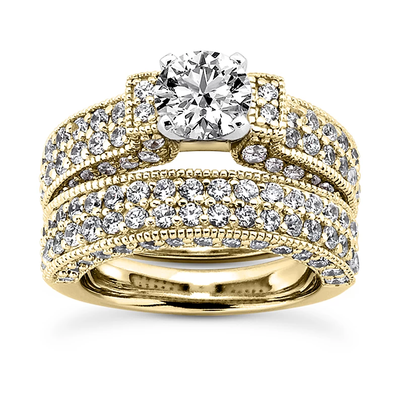 This 14K Gold Diamond Unique Engagement Ring Set consists of a diamond engagement ring and matching band. The engagement ring showcases a 0.50 carat round diamond in the center and 1.02 carats of round diamonds on the sides for a total of 1.52 carat of dazzling diamonds. The band showcases 1.05 carats of dazzling round diamonds. This set is available in Platinum, 18k or 14k yellow, rose, white gold, various sizes, and can be customized with any color and quality diamonds. Please contact us if you would like to customize it.