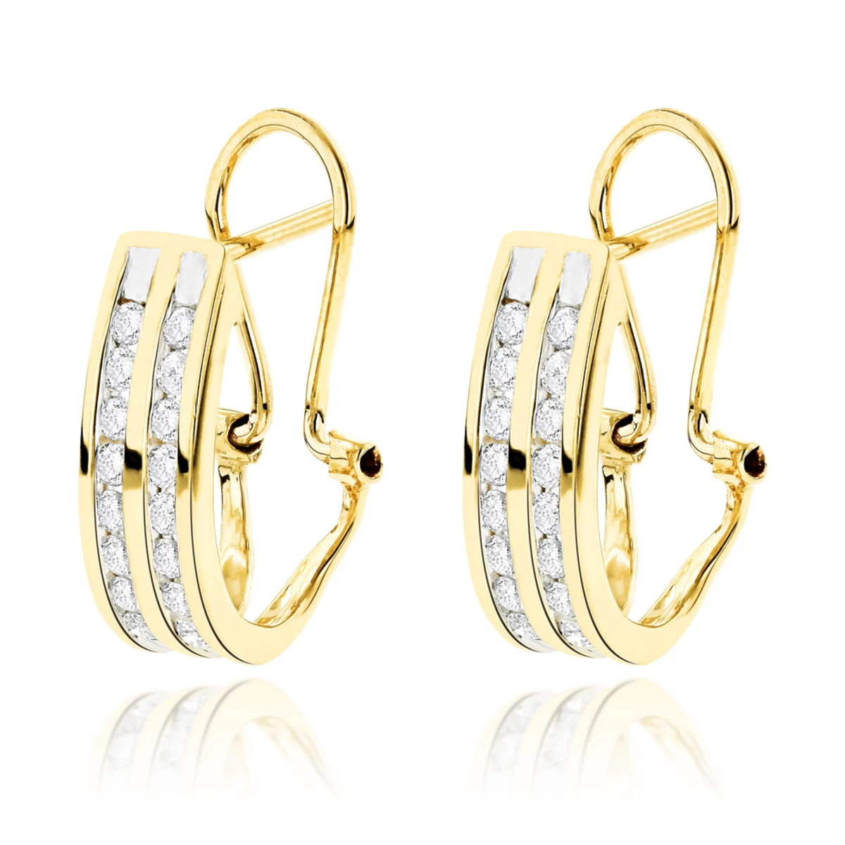 These classic 14K Gold Round Diamond Hoop Earrings weigh approximately 4 grams and showcase 0.63 ctw of sparkling round diamonds channel set in 2 rows per each earring. Featuring omega clasp closures for convenient wear, these unisex round diamond earrings are available in 14K white, yellow and rose gold.