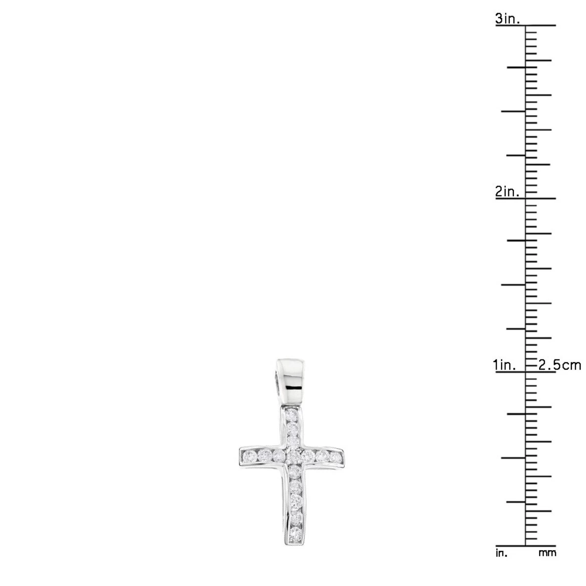 This elegant 14K Gold Round Diamond Mini Cross Pendant showcases one row of sparkling channel set diamonds set in highly polished gold. This exquisite small diamond cross displays a classic design and 0.85 ctw of sparkling round diamonds. Available in 14K white gold, yellow gold and rose gold. You also can personalize this piece or check we’ve already made and create your own design.