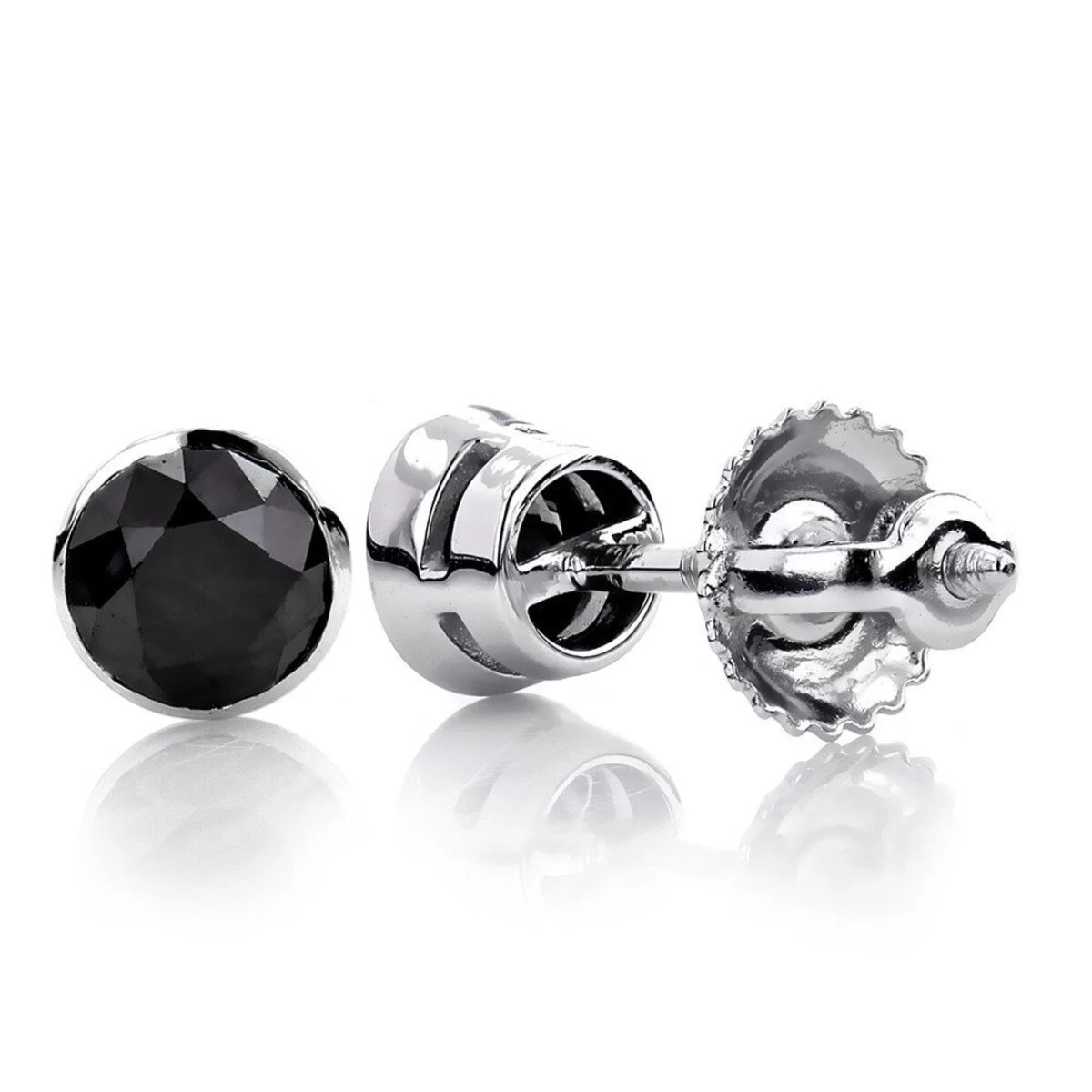 This perfect set of 14K Gold Solitaire Black Round Diamond Bezel Stud Earrings features two perfectly matching round diamonds and a 14K Gold settings with a screw back closure for secure wear. Each round cut diamond earring has a solitaire diamond weighting approximately 1/6 of a carat, for a total diamond weight of 1/3 carats. Classic and luxurious, our versatile solitaire diamond studs are an everlasting display of beauty and excellence. These round diamond stud earrings from our fine diamond jewelry collection make a perfect and classy gift for any occasion, and are available in 14K white, yellow and rose gold.