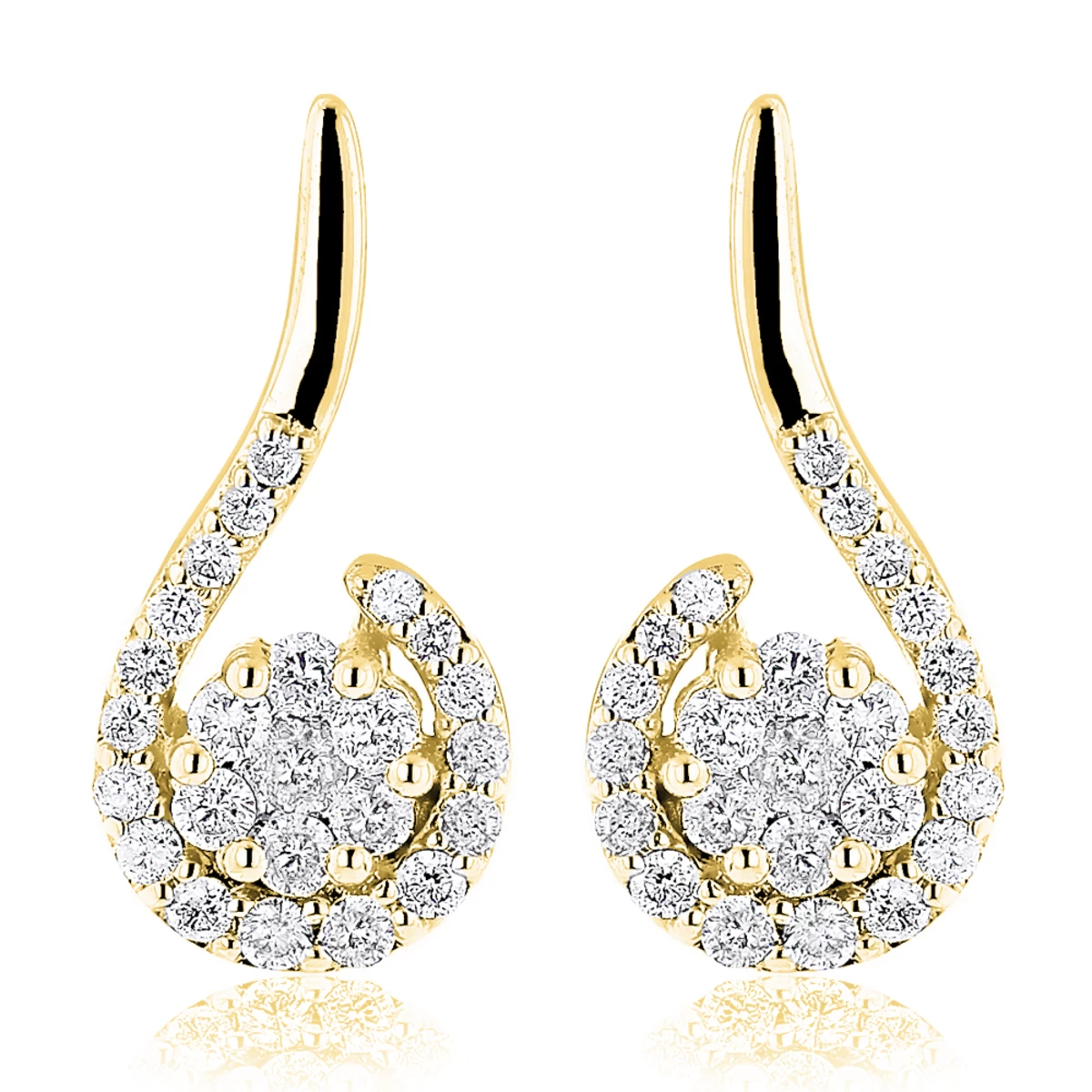 These 14K Gold Swirl Diamond Earrings for Women weigh approximately 5 grams and showcase 0.75 carats of sparkling round diamonds. Featuring a fabulous design and a highly polished gold finish, these elegant ladies diamond earrings are available in 14K white, yellow and rose gold.