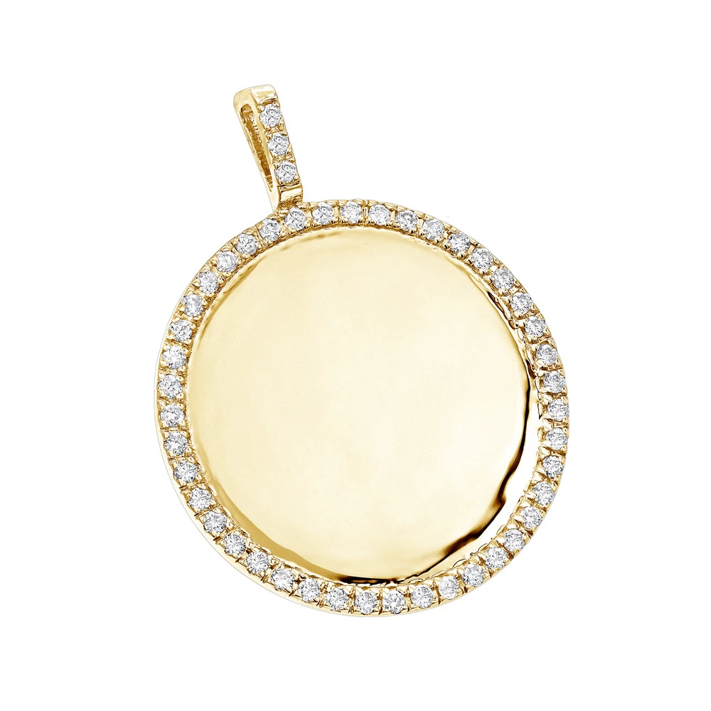 This adorable 14K Gold Diamond Circle Medallion Pendant for Women by Luxurman features 1/2 carats of sparkling round cut white diamonds. This diamond circle pendant is available in 14k yellow gold, rose gold, white gold, as well as 18k gold and Platinum as a custom order; also in various sizes, and can be customized with any color and quality diamonds. Please contact us at 212-398-3123 if your size or desired option is not listed. This beautiful diamond medallion pendant also can be engraved. You also can personalize this piece or check we’ve already made and create your own design.