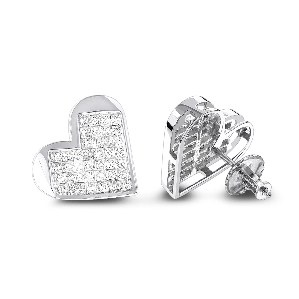 These elegant 14K Gold Princess Diamond Heart Earrings weigh approximately 3 grams and showcase 0.88 ctw of sparkling princess cut, invisibly-set diamonds. Featuring a romantic design and a highly polished gold finish, these exquisite heart-shaped diamond stud earrings are available in 14 Karat white gold, yellow gold, and rose gold.