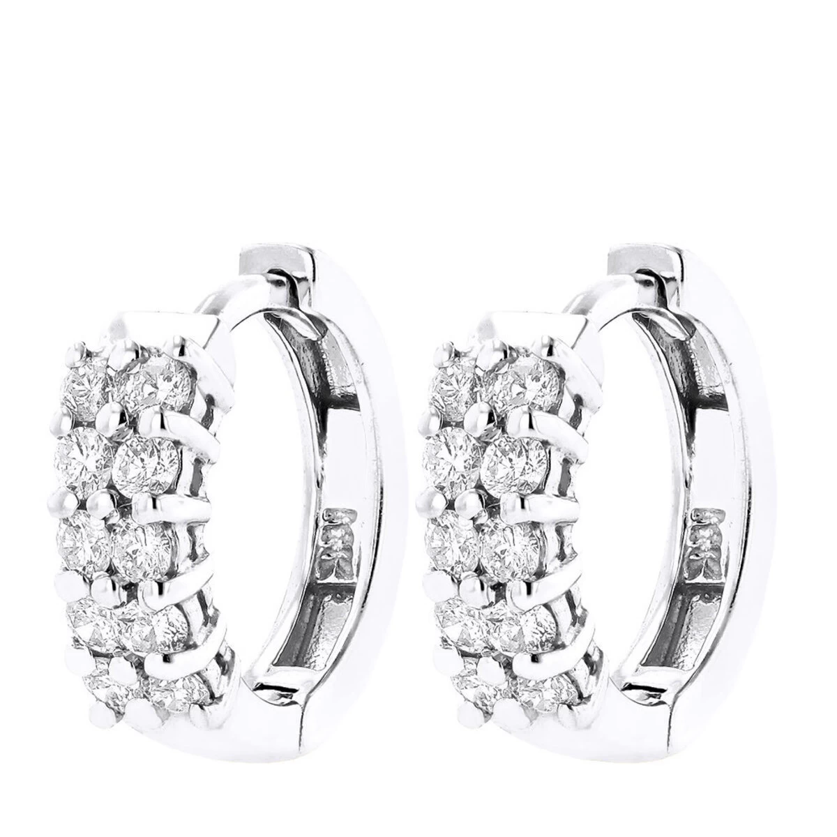 These exquisite 14K Gold Round Diamond Huggie Earrings weigh approximately 3 grams and showcase 0.44 ctw of sparkling round diamonds, each expertly prong set in lustrous 14K gold. Featuring a 2 row design and a highly polished gold finish, these fantastic diamond huggie earrings (small hoop earrings) are available in 14K white, yellow and rose gold.