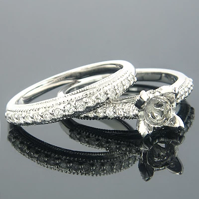 This fabulous 18K Gold Diamond Bridal Ring Set weighs approximately 8 grams and consists of a beautiful diamond engagement ring setting and a perfectly matching diamond wedding band. Featuring an elegant design and 0.58 ctw of sparkling prong-set round diamonds, this exquisite bridal diamond engagement ring set is available in 18K white, yellow and rose gold.