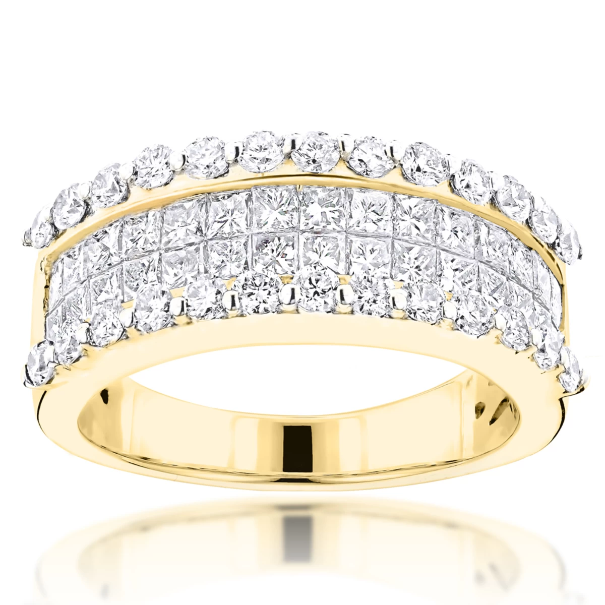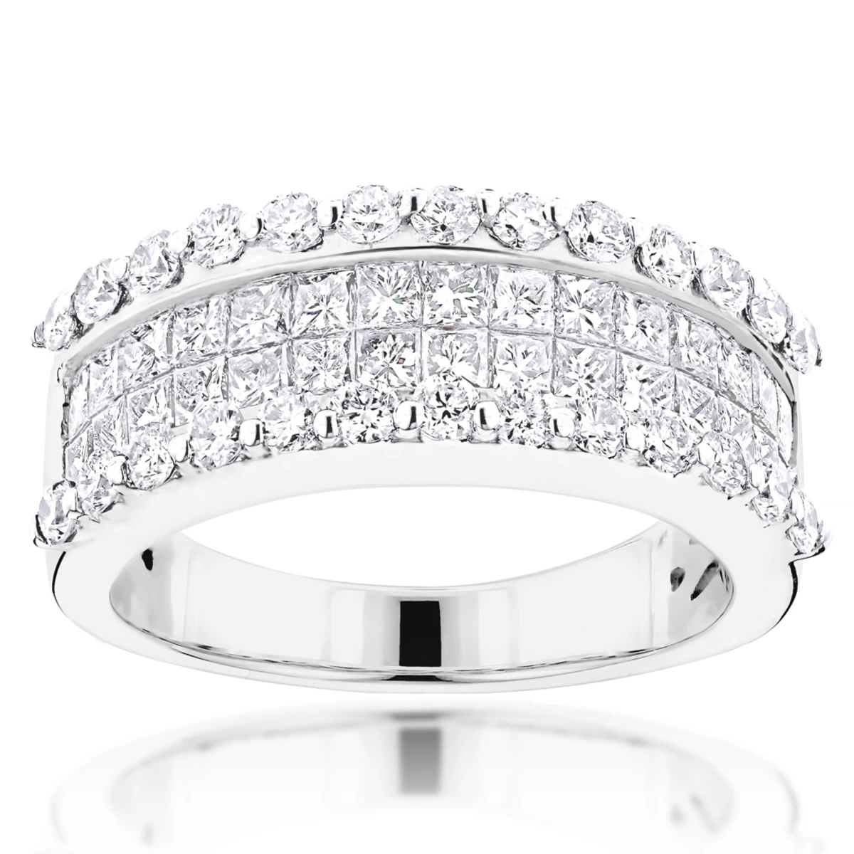 This luxurious 18K Gold Round and Princess Cut Diamond Band from our designer diamond rings collection showcases 2.28 carats of dazzling invisibly-set princess cut diamonds and prong-set round diamonds. Featuring an intricate multi-row design and a highly polished gold finish, this beautiful designer diamond ring is available in 18 Karat white gold, yellow gold, and rose gold.