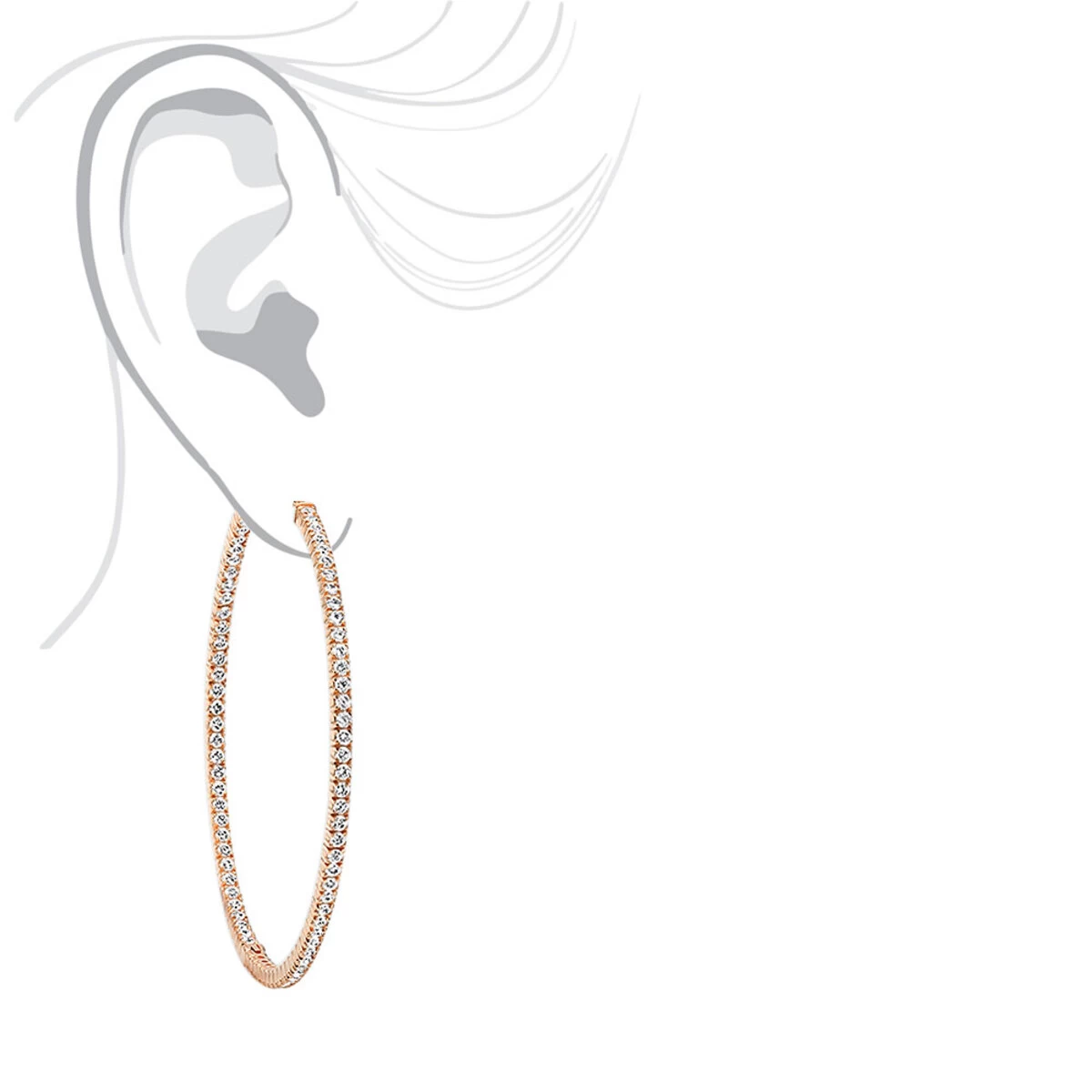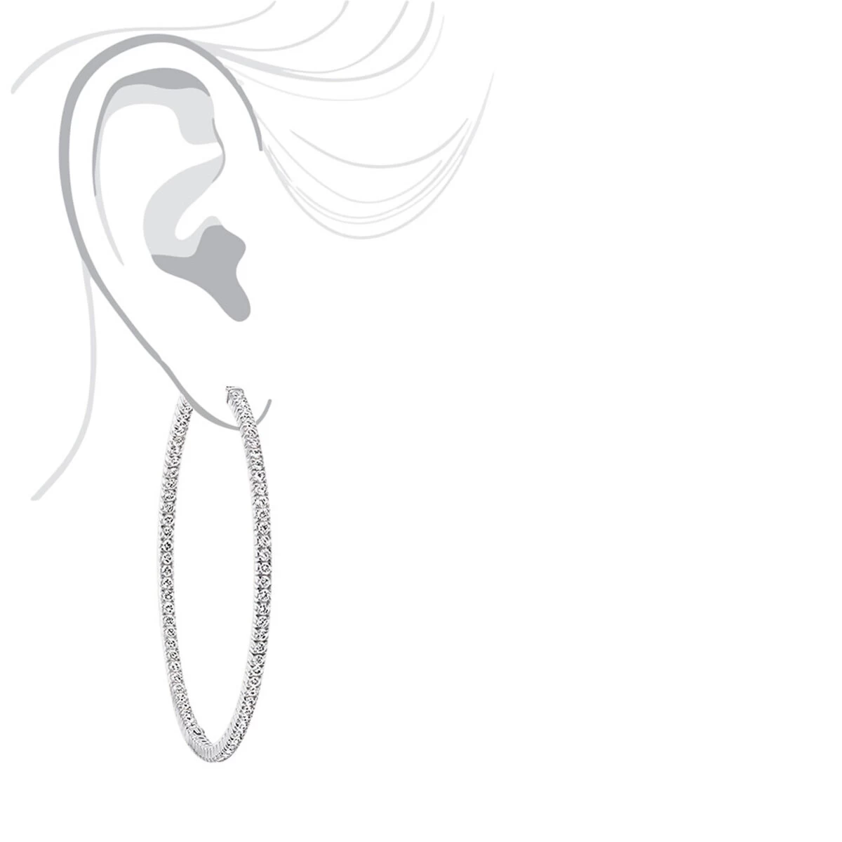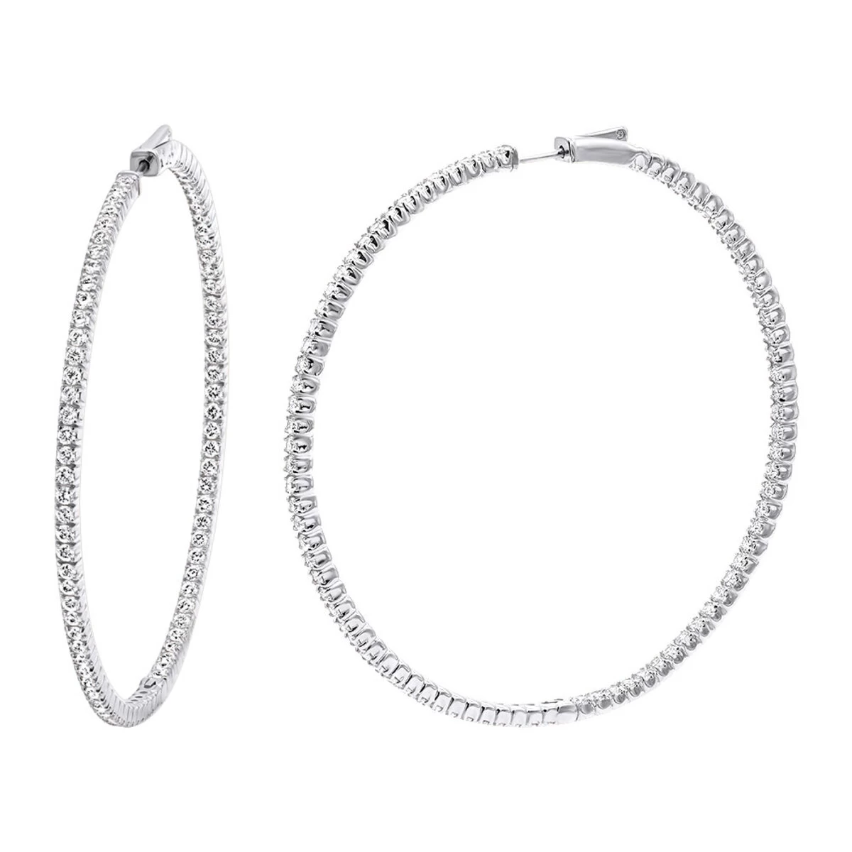 From our diamond hoop earrings for women collection: These extremely fashionable 2.5mm wide 2.5 inches in diameter Inside Out Diamond Hoop Earrings showcase remarkable 5 carats of genuine G color VS clarity white sparkling round diamonds masterfully set inside and out each earring and are simply mesmerising. These statement earrings have a flawless design and were expertly crafted to meet the highest industry standards, they are meant to be worn without any need for further jewels due to their eye-catching, attention commanding outlook. Also featuring a highly polished gold finish, these gorgeous diamond hoop earrings are available in 14K white, yellow and rose gold.