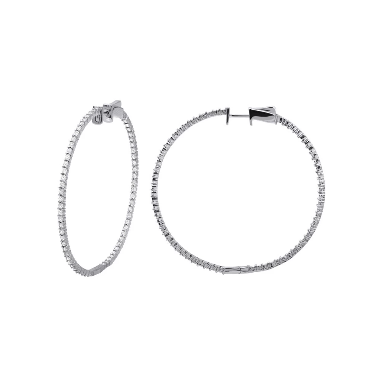 These 2 Inch Round Diamond Hoop Earrings weigh approximately showcase 1 carat of sparkling round diamonds, each expertly set in lustrous 14K gold. Featuring an inside out look and a highly polished gold finish, these versatile diamond hoop earrings are available in 14K white, yellow and rose gold.