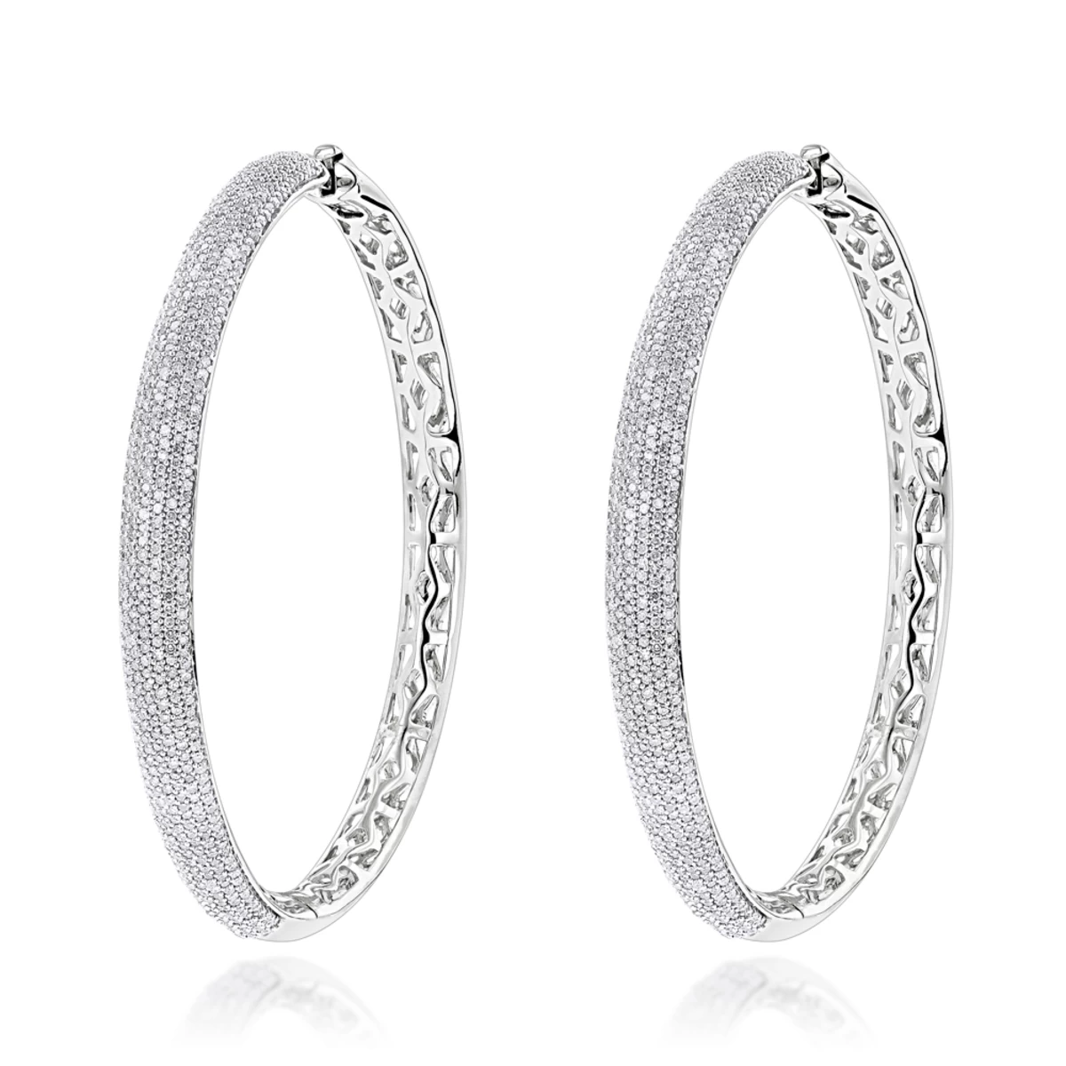 These 2 Inch Diamond Hoop Earrings in 14K Gold weigh approximately 21 grams and showcase 2.2 carats of genuine diamonds. Featuring an oversized design and a highly polished gold finish, these fabulous ladies diamond earrings are available in 14K white, yellow and rose gold.