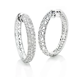 These 3 Row Diamond Hoop Earrings in 14K gold weigh approximately 9 grams and showcase 4.41 carats of dazzling round diamonds. Featuring a luxurious design and an intricate gallery back, these fabulous ladies diamond hoop earrings are available in 14K white, yellow and rose gold.