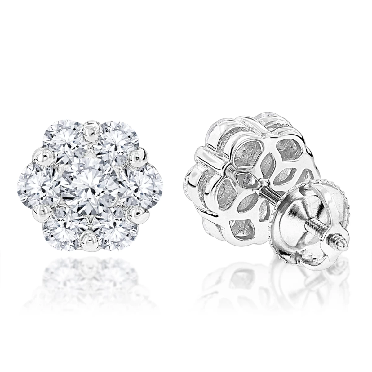 6 Carat Look Large Diamond Cluster Earrings 14K White Gold Studs 2 Carats