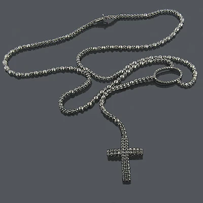 This stunning Black Rhodium 10K Gold Black Diamond Rosary Chain Necklace from our custom diamond jewelry collection showcases 10.25 ctw of sparkling fancy black diamonds, each expertly prong or bezel set in highly polished gold. Featuring a unique design, an all-black look and a highly polished gold finish with heavy black rhodium plating, this fabulous black diamond cross chain necklace is a hot ticket item and is fully customizable. Available with different fancy color diamonds and in 10K white, yellow and rose gold.