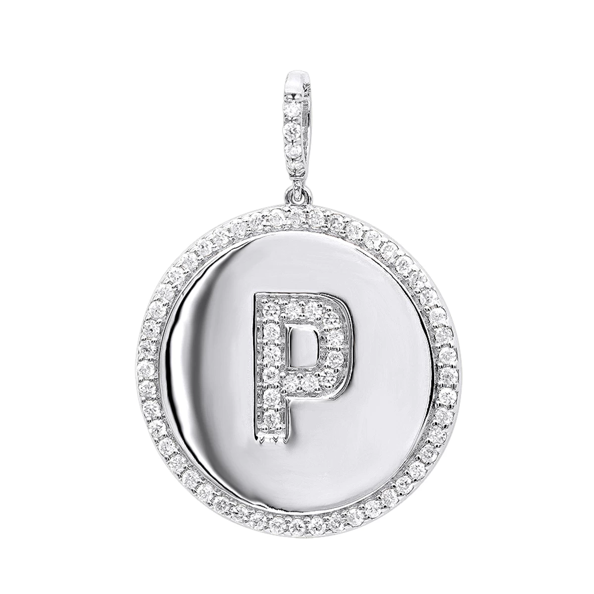 From our ladies diamond pendants collection: Crafted in solid 14K gold this Diamond Circle Pendant for Women by LUXURMAN is lined with 0.7 carats shimmering round cut genuine diamonds. Featuring a classic round medallion shape with highly polished gold finish, this alphabet diamond pendant can feature a letter of your choice in the middle, currently the image is featuring a letter “P” but you are welcome to select your own letter! This diamond alphabet pendant makes a very memorable present and also features a line of diamonds going all the way around the pendant as well as iced out bail bail, this lovely customizable diamond pendant for women is 1 3/8in (35mm) long and 1 inch (25mm) wide, available in 14K yellow, rose, white gold and will make a nice touching present for any occasion. The pendant can be customized with any alphabet letter. Chain must be purchased separately. You also can personalize this piece or check we’ve already made and create your own design.