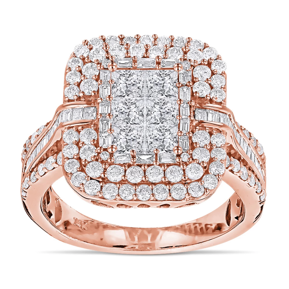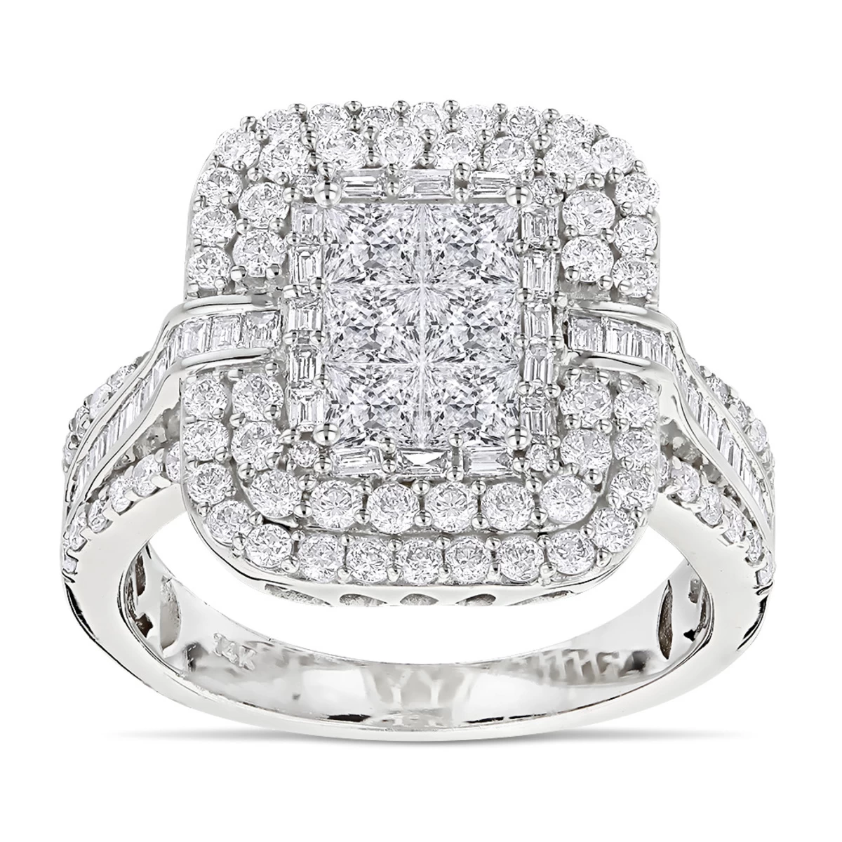 Beautiful Designer Diamond Rings! This exquisite 14K Gold Diamond Ring weighs approximately 7 grams and showcases 2.40 ctw of dazzling invisibly set princess cut diamonds, channel set baguette diamonds, and prong set round diamonds. Featuring an intricate design and a highly polished gold finish, this women’s diamond ring is available in 14K white, yellow and rose gold.