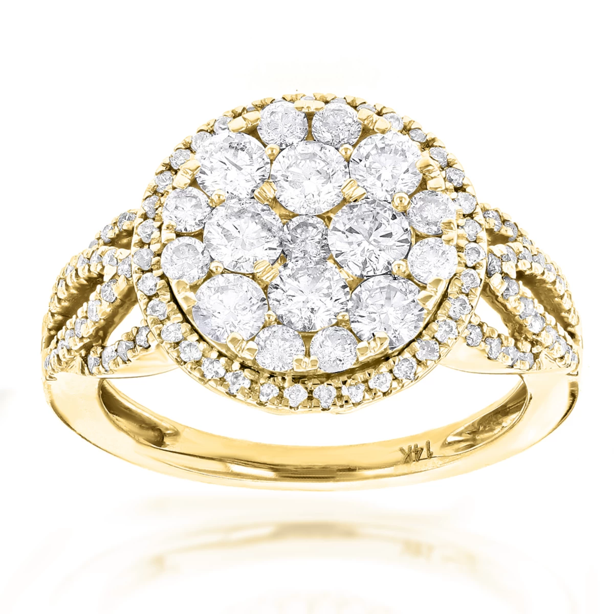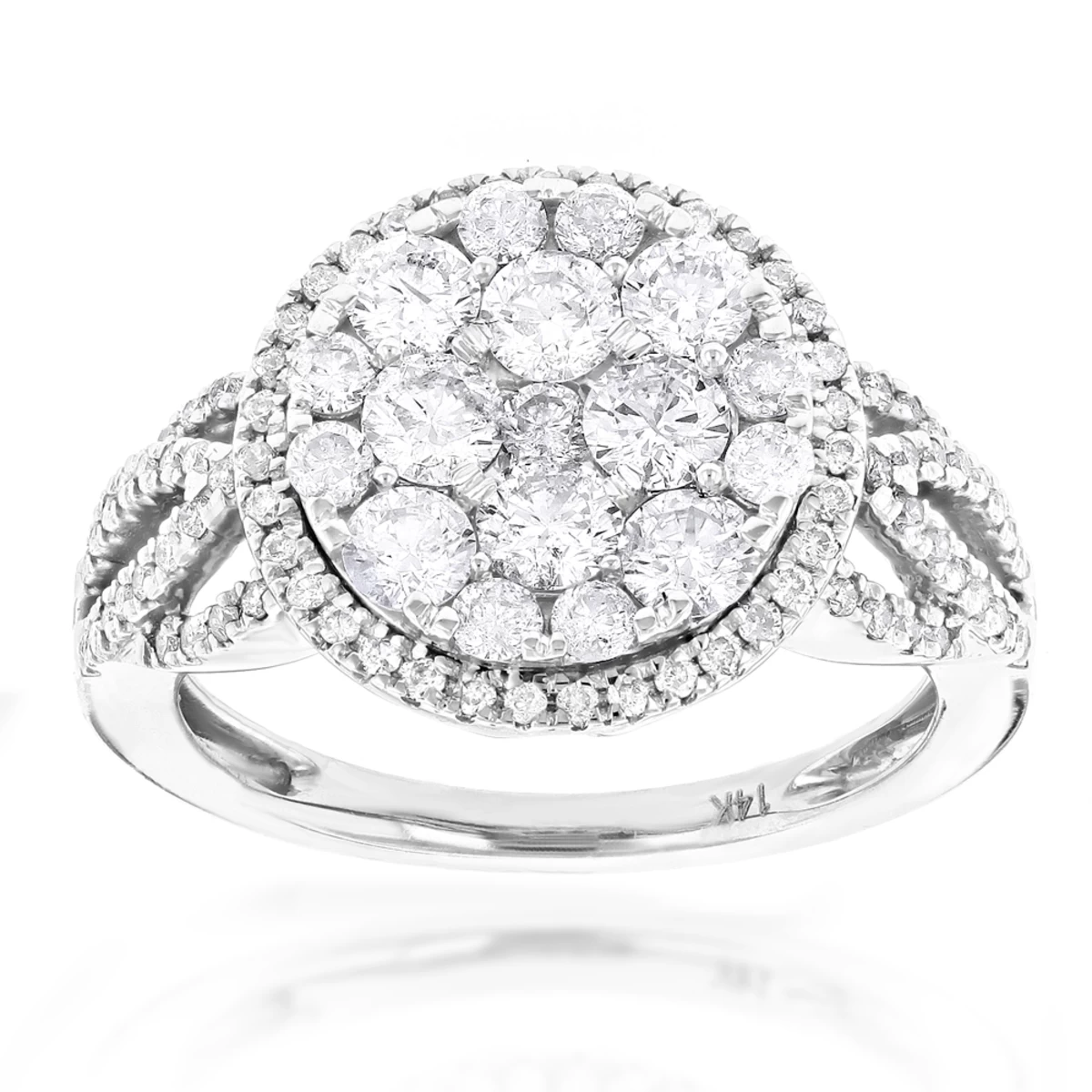 This Designer Diamond Cluster Ring from our Unique Engagement Rings collection weighs approximately 5 grams and showcases 1.89 carats of dazzling round diamonds. Featuring a luxurious design and a highly polished gold finish, this ladies diamond ring is available in 14K white, yellow and rose gold.