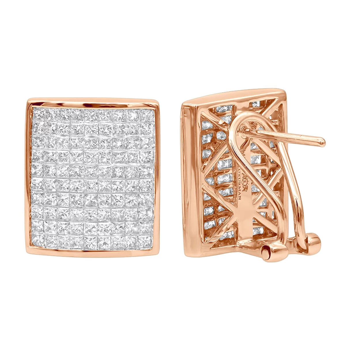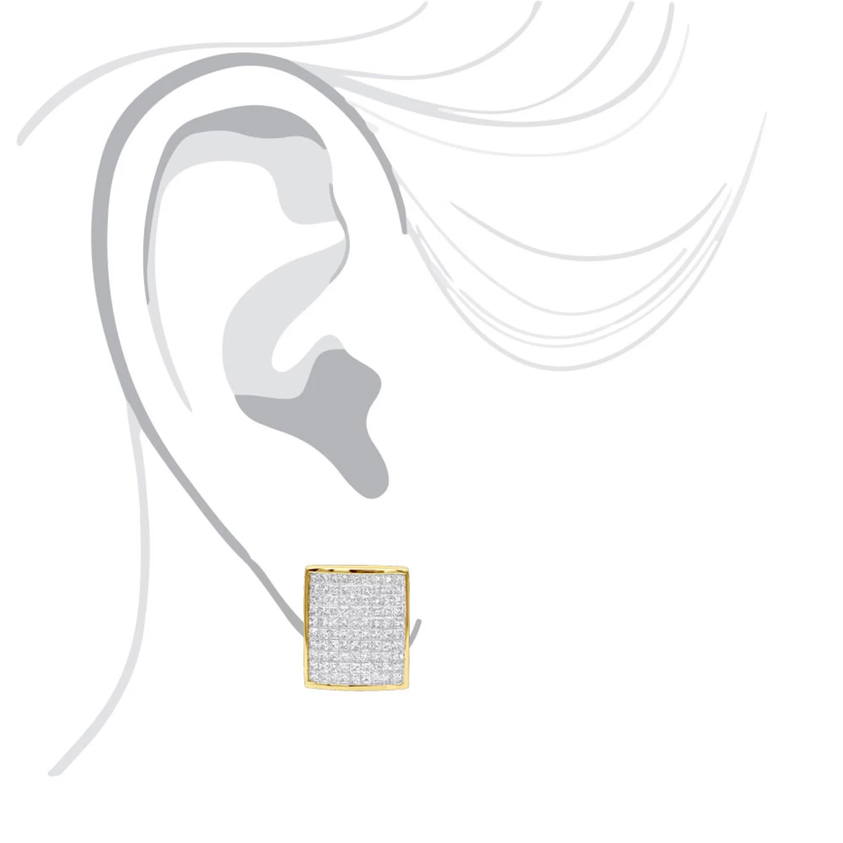 These Designer Diamond Earrings in 14K gold weigh approximately 8 grams and showcase 2.94 carats of dazzling princess cut invisibly-set diamonds. Featuring a luxurious design and a highly polished gold finish, these designer diamond earrings are available in 14K white, yellow and rose gold.