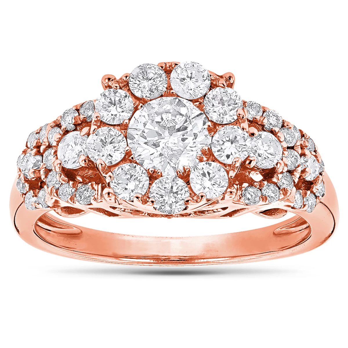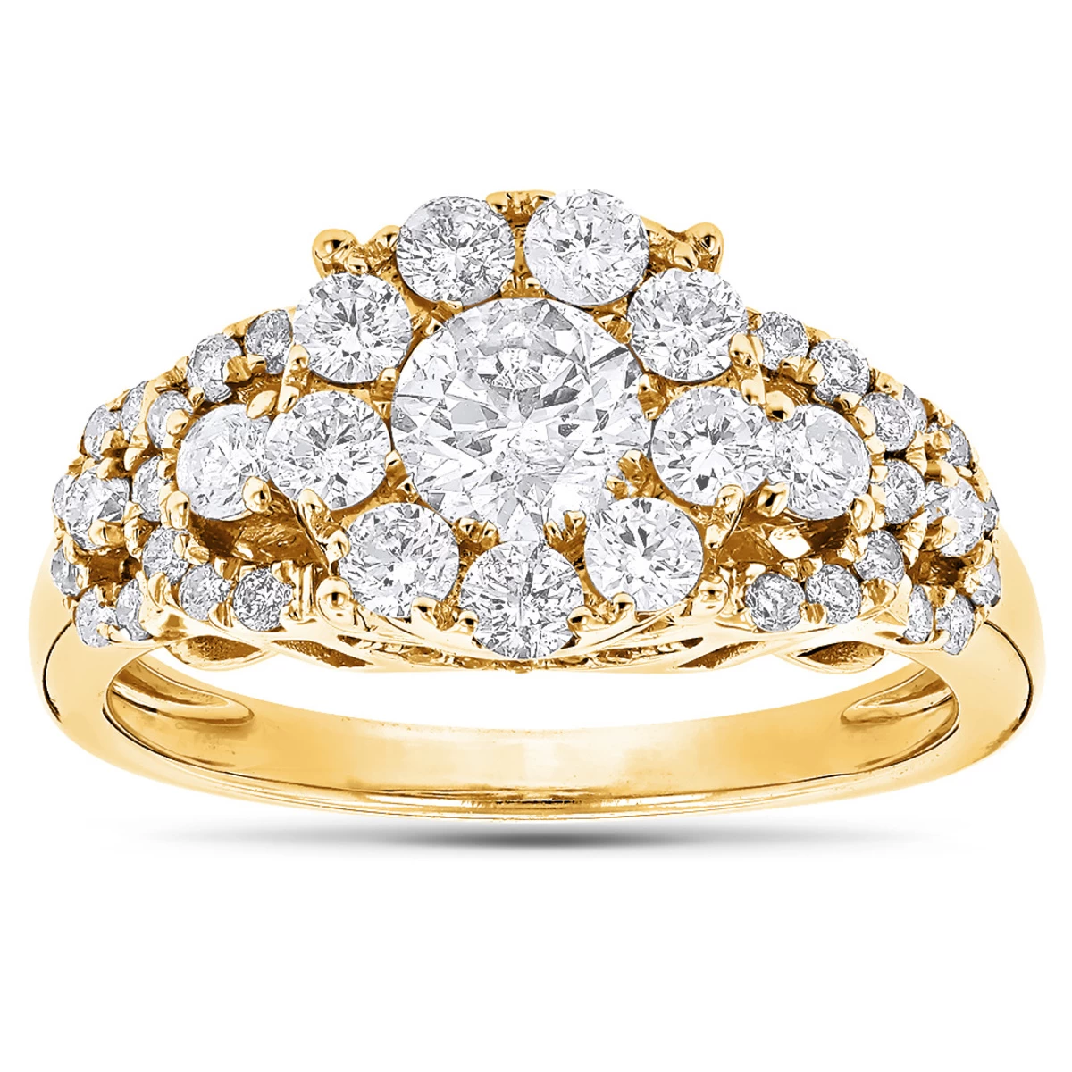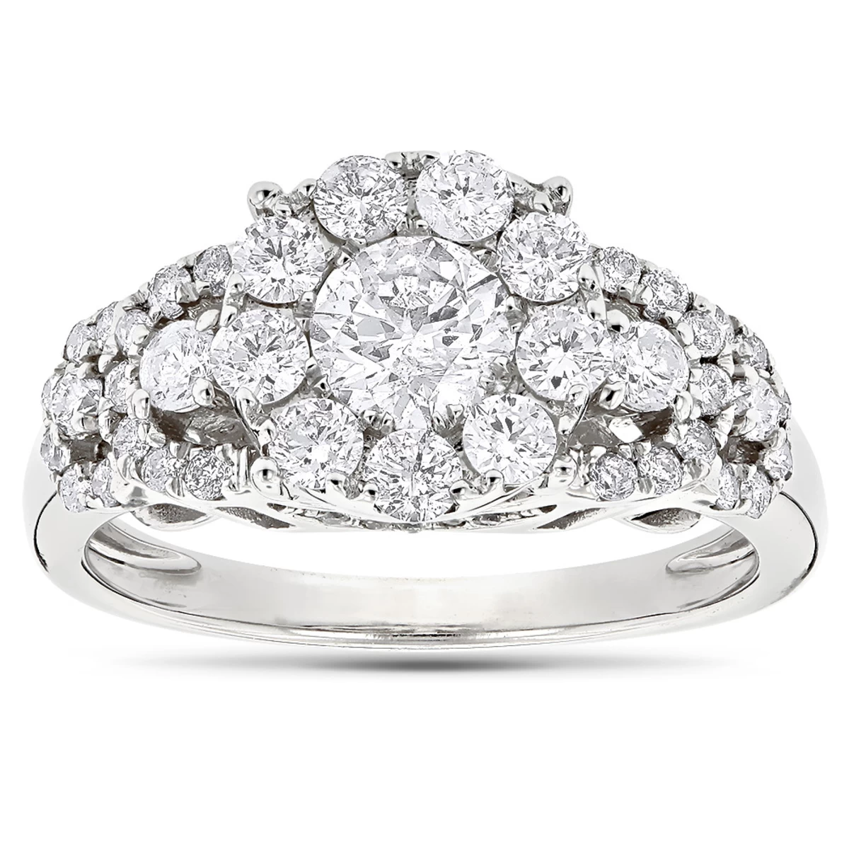This Designer Diamond Engagement Ring in 14K gold weighs approximately 5 grams and showcases 1.61 carats of sparkling round diamonds. Featuring a luxurious cluster design and a highly polished gold finish, this ladies diamond ring is available in 14K white, yellow and rose gold.