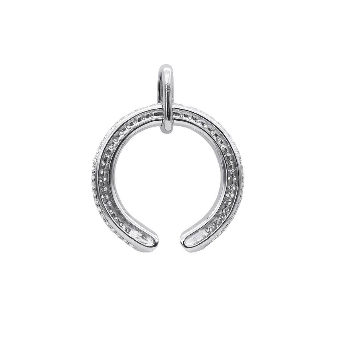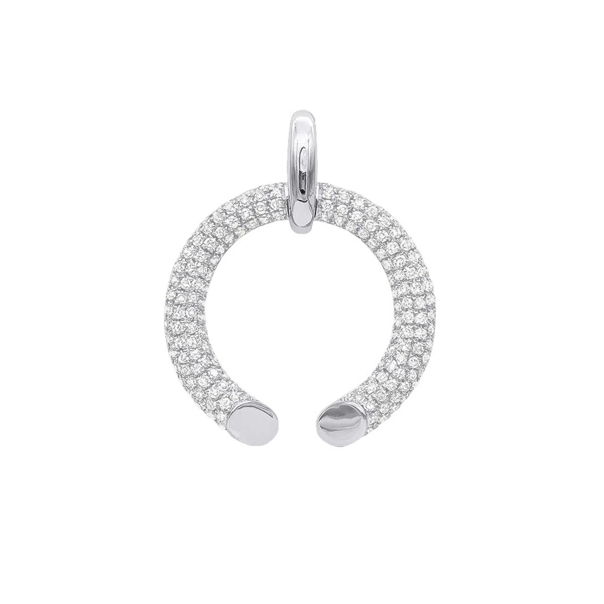 From our ladies diamond necklaces collection This unique designer horseshoe diamond pendant necklace for women is a perfect good luck symbol; the pendant is made in solid 14k gold enchants with its innovative and cutting-edge design. Crafted with extreme attention to detail, this pendant showcases an open circle shape encrusted with numerous round diamonds and decorated with highly polished golden tips and authentic voluminous bail. Measuring 19mm (3/4in) wide and 1in (25mm) long, this intricate ladies diamond pendant necklace is available in 14K white, yellow or rose gold and includes an extendable 16 inch to 18 inch chain. Make a bold statement with this brilliant and sophisticated unique diamond pendant necklace! You also can personalize this piece or check we’ve already made and create your own design.