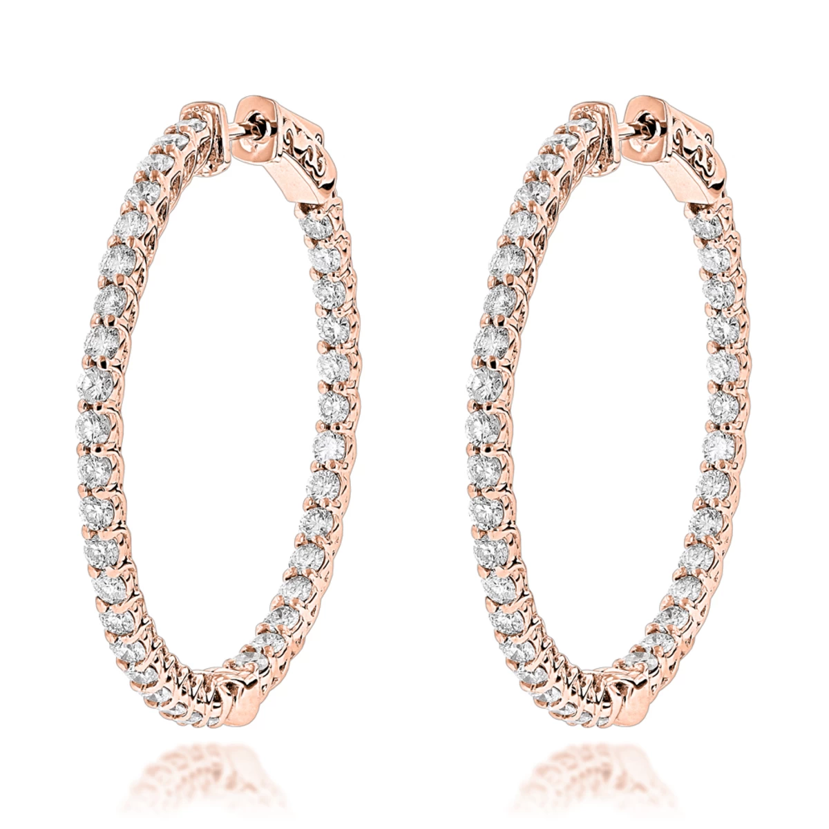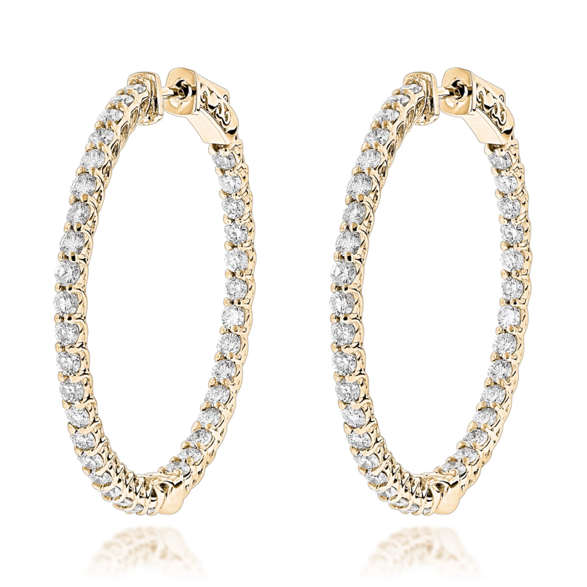 Elegant Diamond Hoops! These 14K Gold Diamond Hoop Earrings by Luxurman with an inside out design weigh approximately 9 grams and display 3.5 carats of sparkling round diamonds, each expertly prong set in lustrous 14K gold. Featuring a luxurious inside out look, secure lock clasps and a highly polished gold finish, these fabulous diamond hoop earrings from our designer diamond earrings collection are available in 14K white, yellow and pink gold.