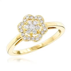 Flower Diamond Rings: This 14K Gold Diamond Cluster Ring weighs approximately 3 grams and showcases 0.4 carats of sparkling round diamonds. Featuring a lovely cluster design and a highly polished gold finish, this ladies diamond ring makes a unique pre-set diamond engagement ring is available in 14K white, yellow and rose gold.