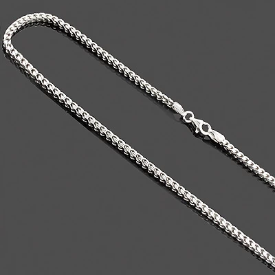 This Italy Made Thin Franco Chain in Sterling Silver (2mm wide) is a squared off chain and weaved together for a luxurious look. It takes the top of the line craftsman to make this silver chain, where each individual facet is welded in a perfect fit for excellent movement and flexibility. This solid Italy made 925 sterling silver Franco chain will not kink and you can even roll it around your finger! It is a polished type chain, yet it catches the light with your every move. This chain is 2mm in width and 36 inches in length. It’s available in different chain lengths.