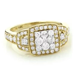 This Halo Princess Cut Diamond Engagement Ring showcases 1.2 carats of sparkling diamonds for a 2.5 carat look. Featuring a lovely design and a highly polished gold finish, this ladies cluster diamond ring makes a unique pre-set diamond engagement ring, and is available in 14K white, yellow and rose gold.