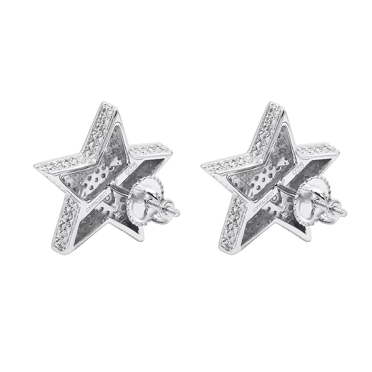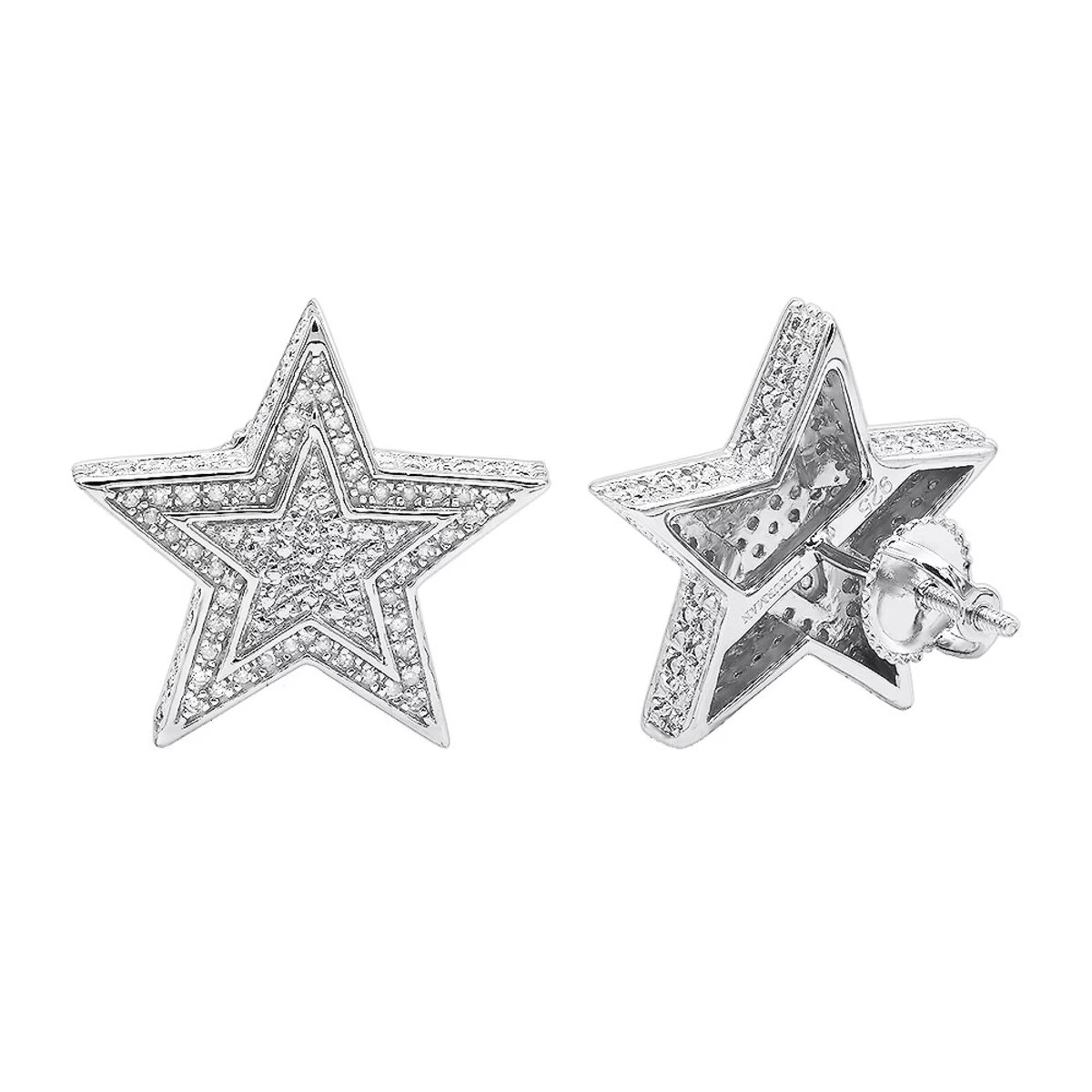 These Large Diamond Star Earrings in sterling silver feature an oversized classy 5 pointed star in a star design decorated with 0.2 carats of genuine diamonds, the earrings are pretty large at 3/4 inch (19mm) and feature screwback closures for secure wear.