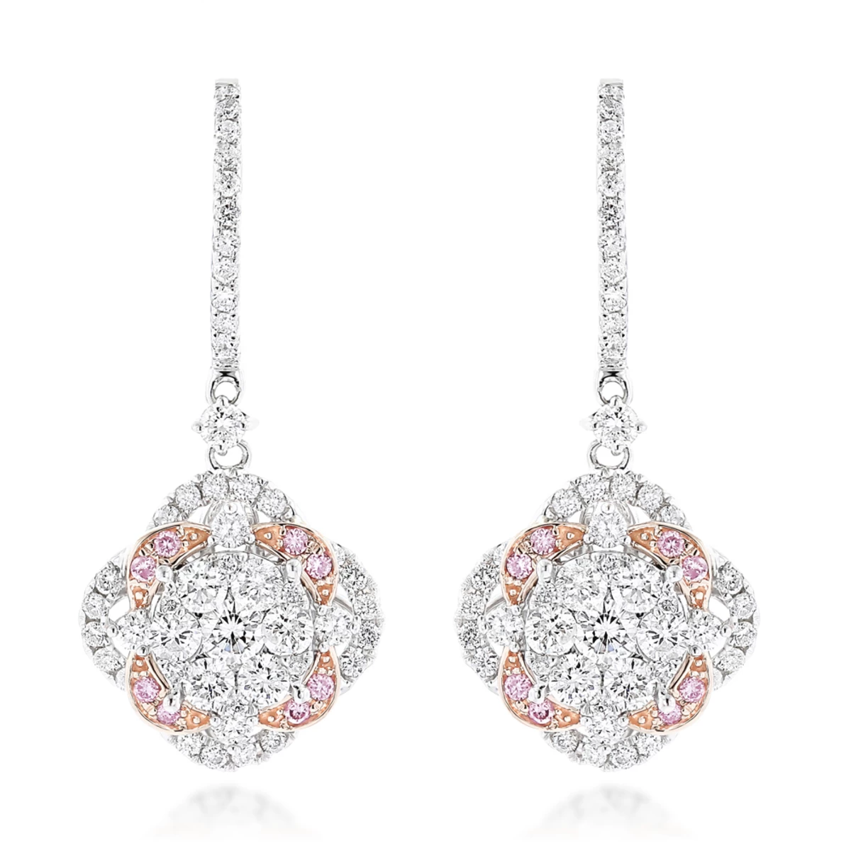 These Designer Flower Cluster Diamond Earrings for Women by Luxurman showcase 2.4 carats of high quality natural white and pink diamonds masterfully set in 14K Gold. These unique ladies diamond earrings with flower gallery on the back can be purchase as a set – matching white and pink diamond pendant and ring are available below.