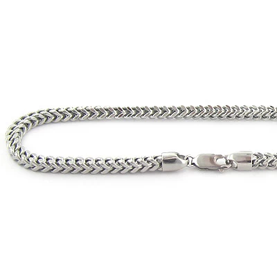We are proud to present this exclusive men’s 10K solid white gold Franco chain necklace with a lobster claw lock. This solid gold FRANCO chain for men is a squared off chain and weaved together for a very rich look. It takes the top of the line craftsman to make this men’s gold chain, where each individual facet is welded in a perfect fit for excellent movement and flexibility. This Men’s gold Franco necklace will not kink and you can even roll it around your finger! It is a polished type chain, yet it catches the light with your every move and is extremely durable in the 10K gold. This chain is 4mm wide.