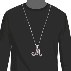 Large 14K White Gold White Pink Diamond Initial M Letter Pendant Necklace 3.4ct