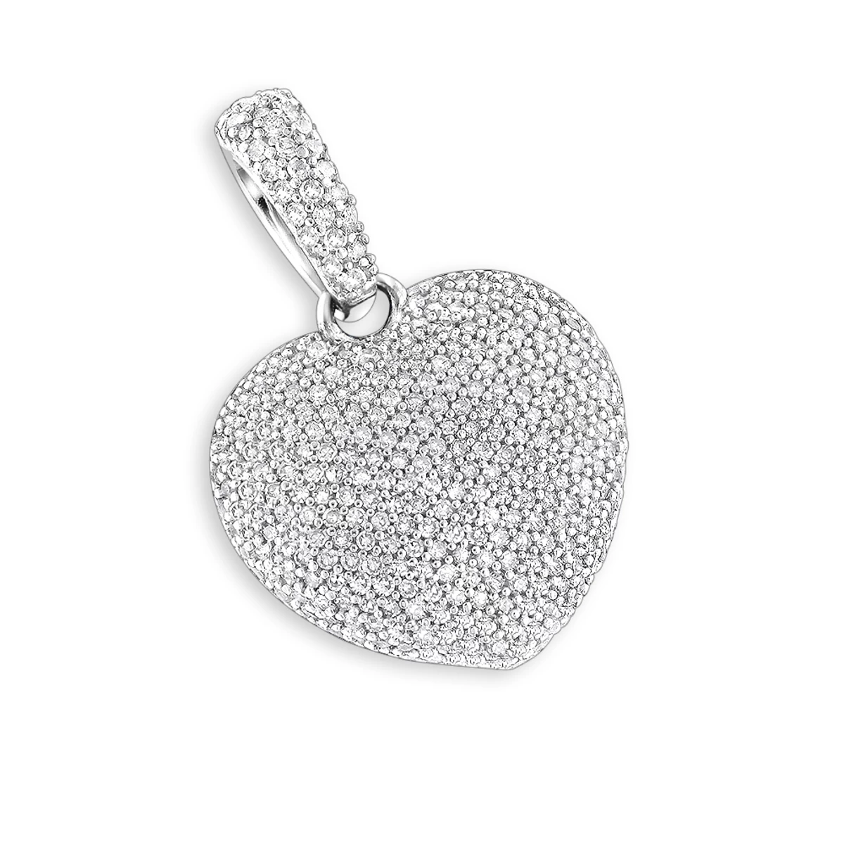 This Pave Diamond Heart Necklace Pendant in 14K Gold weighs approximately 3 grams and showcases a fully encrusted design. Featuring a 3-D puffed heart style and a highly polished gold finish, this 0.92-carat diamond heart pendant is available in 14K white, yellow and rose gold. Please note: chain is for illustration purposes only and is sold separately. You also can personalize this piece or check we’ve already made and create your own design.