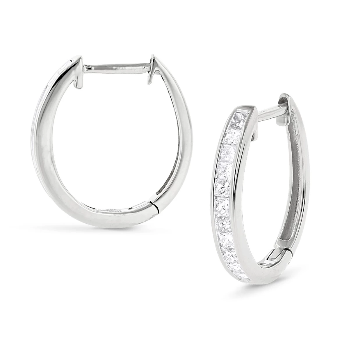 Luxurman Huggie Earrings! These Small 14K Gold Princess Cut Diamond Hoop Earrings feature a classic design with a one row of 0.6 carats channel set dazzling princess cut diamonds. These diamond huggie earrings with english lock are available in 14K white, yellow and rose gold.