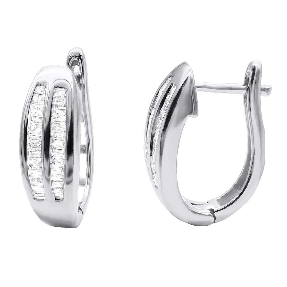Our glistening solid gold baguette diamond earrings hoops can be worn by both men & women! These diamond hoop earrings feature 1/2ct of sparkling channel-set baguette diamonds and convenient omega closures. Available in 10k or 14K yellow gold, white gold and rose gold.