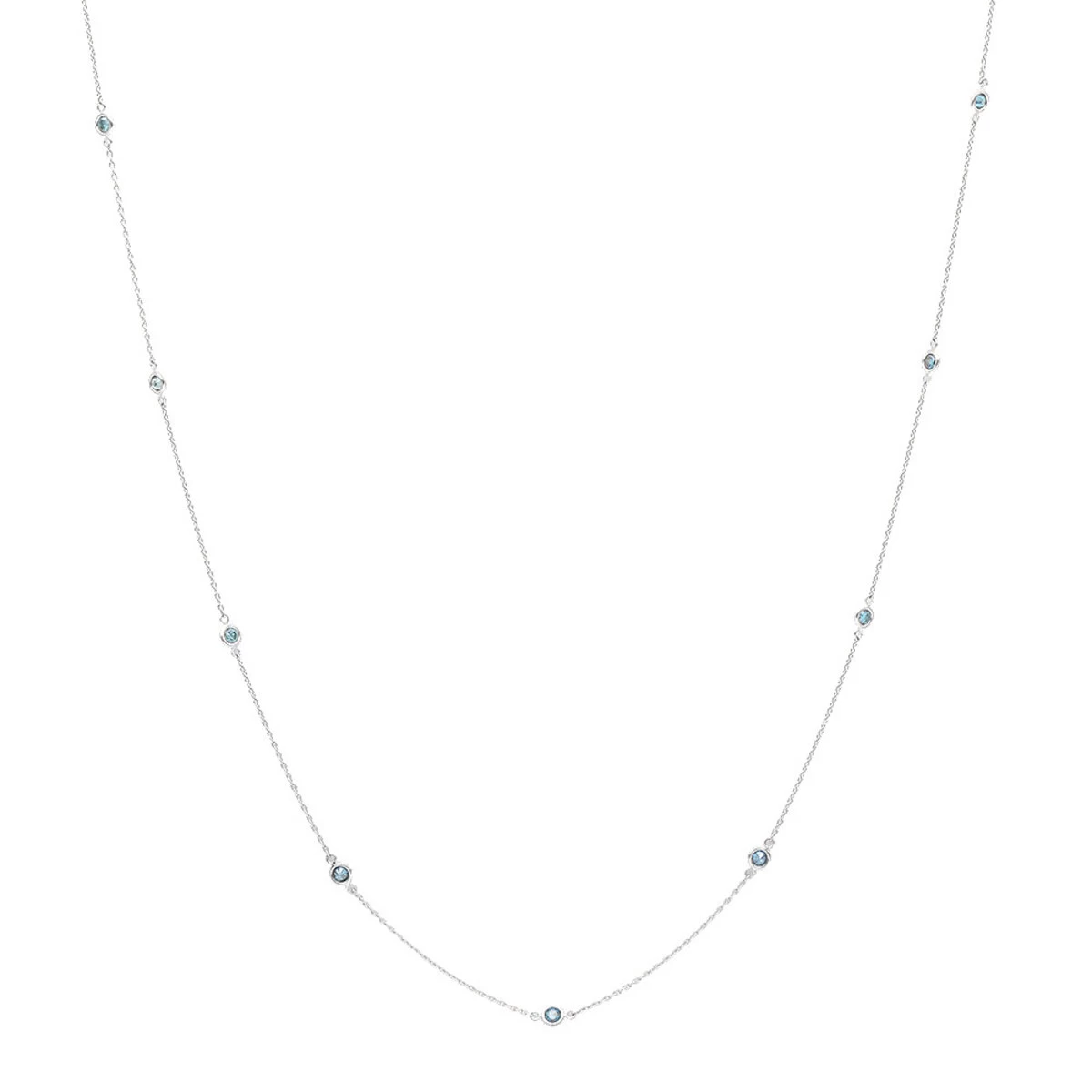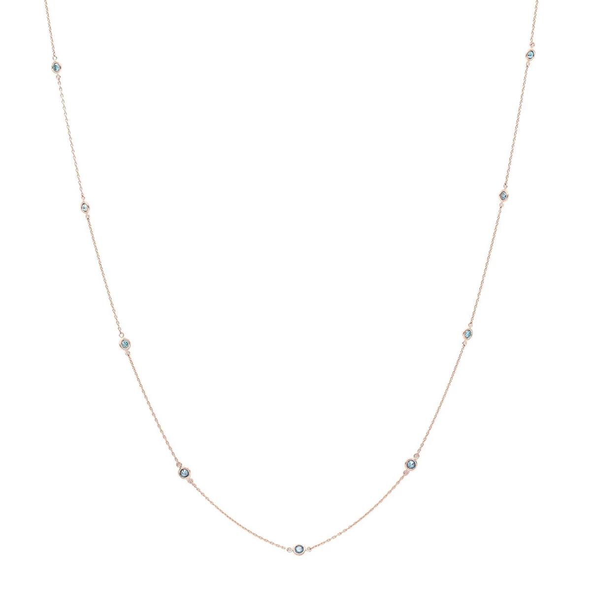 From our ladies diamond necklaces collection we present this unique diamonds by the yard necklace with blue diamonds. What exactly is a Diamonds by the Yard piece of jewelry? It is a rope or other type of usually gold chain, with round diamonds set in between along side the chain, connecting chain pieces, that can be used to make elaborate bracelets and necklaces that possess mounds of elegance and allure. This beautiful Diamonds by the Yard Women’s Necklace 14K Gold Chain featuring 1.4ct of precious blue round diamonds is a perfect example of all this. A diamond necklace is an amazing gift for any occasion and this particular one definitely will not disappoint even the most sophisticated lady. Available in 14K yellow, white and rose gold.