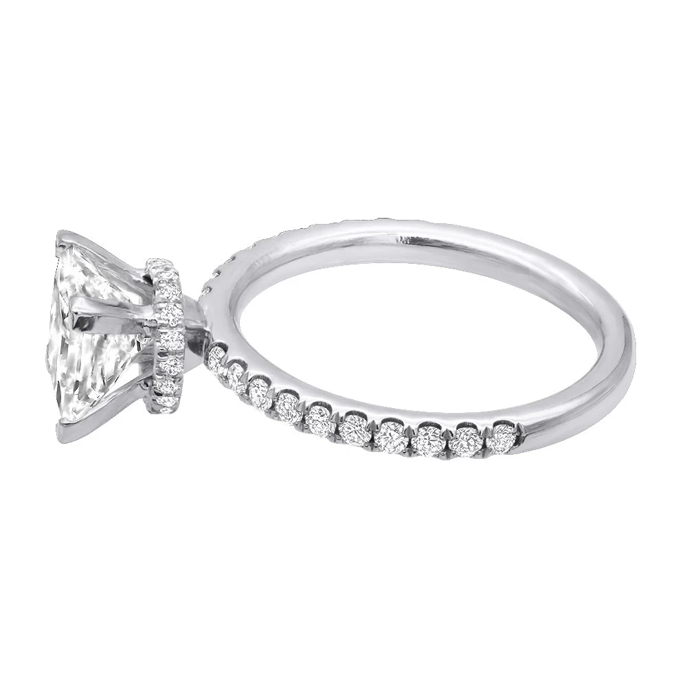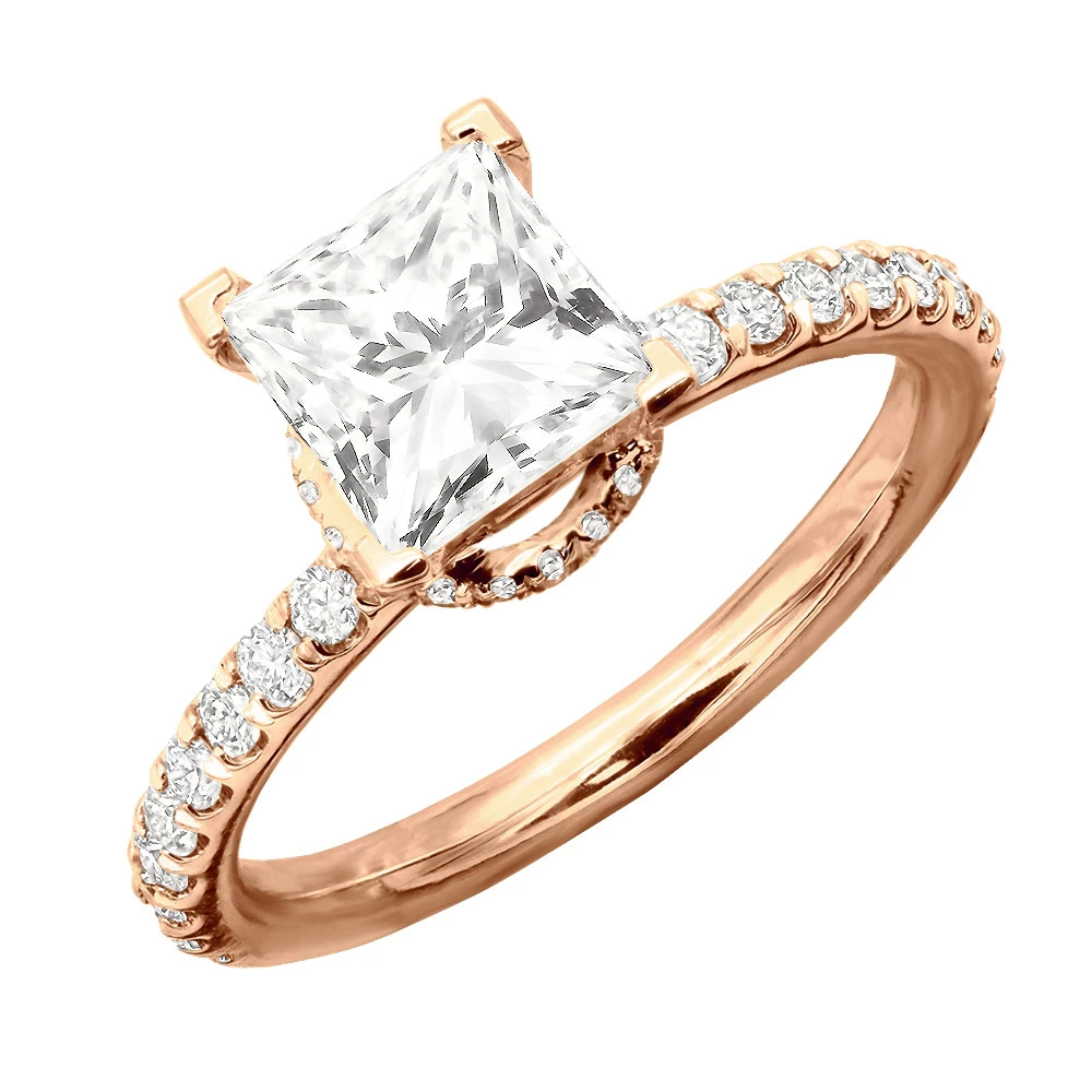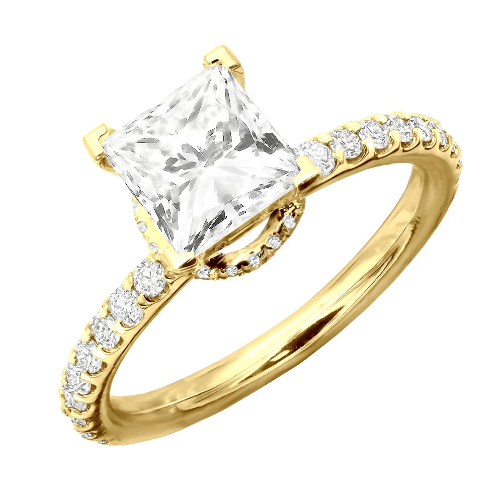 Behold the epitome of love and devotion: our Princess Cut Diamond Engagement Ring. Designed to capture hearts and dreams, this enchanting ring showcases a mesmerizing princess-cut diamond, exuding brilliance from every angle. Expertly crafted in enduring precious metal, its elegant and contemporary setting symbolizes the promise of forever. Each facet of the diamond reflects the depth of your affection, evoking a sense of wonder and joy. The band and the prongs are also intricately encrusted with round diamonds. Make your moment truly unforgettable with this ring that celebrates the uniqueness of your love story, a timeless symbol of your commitment and shared journey ahead.