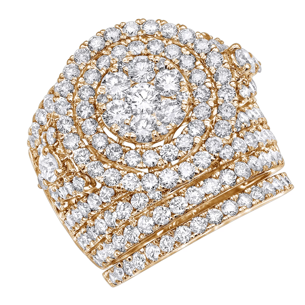 Unique Luxurman Diamond Bridal Sets: this very Unique 5 Carat Diamond Engagement Ring and Wedding Band Set is done in 14k gold and features wide diamond engagement ring with cluster set round diamonds and halo setting and a matching diamond wedding band; this cluster diamond engagement ring set is available in 14k white gold, yellow gold and rose gold as well as 18k gold as a custom order.
