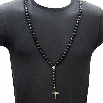 This White Yellow Black Diamond Cross Rosary with large faceted beads is the latest trend in jewelry. Featuring a 10K gold cross pendant with 1.65 carats of sparkling white, yellow and black diamonds, this unique hip hop jewelry piece is fully customizable; contact us with requests at 212-398-3123.